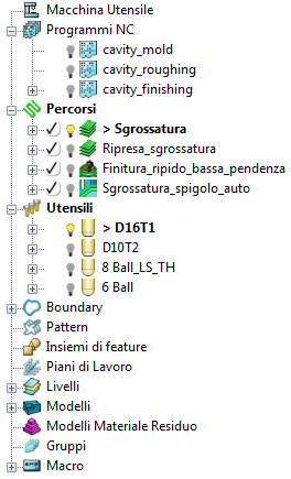 Durante la creazione di entità quali i percorsi utensile, è necessario selezionare altre entità, ad esempio l'utensile, un piano di lavoro, un pattern/una boundary e, se il percorso utensile deve essere post-processato, il programma NC. Se tali entità sono attive, vengono selezionate automaticamente.