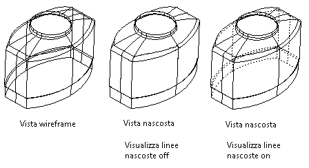 Visualizza linee nascoste - Deselezionare questa opzione in modo che non siano tracciate linee nascoste. Selezionare questa opzione per tracciare linee nascoste usando linee tratteggiate.