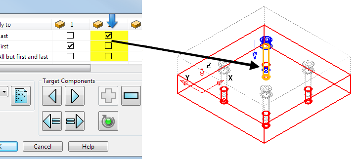 Nell'esempio seguente, è selezionata la prima riga, che rappresenta la Power Feature foro filettato. La regola Power Feature mostra che questa feature è applicata solamente all'ultima intersezione, e l'evidenziazione sul modello riflette tale operazione: