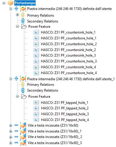 Le Power Feature vengono generate automaticamente e il modello e la struttura dell'assieme vengono aggiornati: