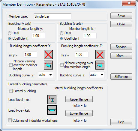 Pressing the More button opens an additional dialog box for definition of the remaining parameters of a member type, described in the code, such as: equivalent moment coefficients, section parameters, etc.