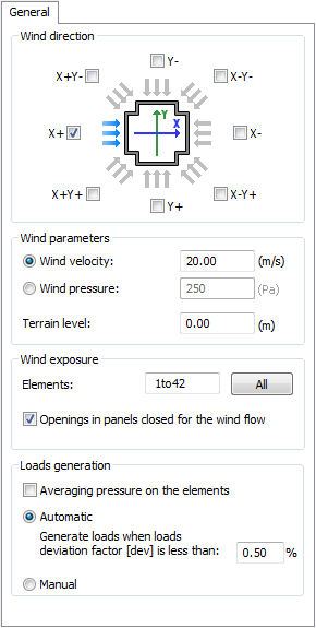 - Specify which elements are exposed to the wind, and indicate if the openings in the panels must be considered as closed or not.