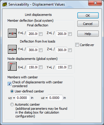 Limit displacements are defined as member deflection in the directions X and Y, resultant deflection yz, and node displacements in the directions X and Y. Additionally, while defining member limit deflections, you can determine if a member is a cantilever.