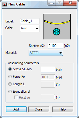 When selected, it defines the normal stress, calculated with respect to the cable chord, for an assembling case load. Enter the value of the stress in the appropriate field.