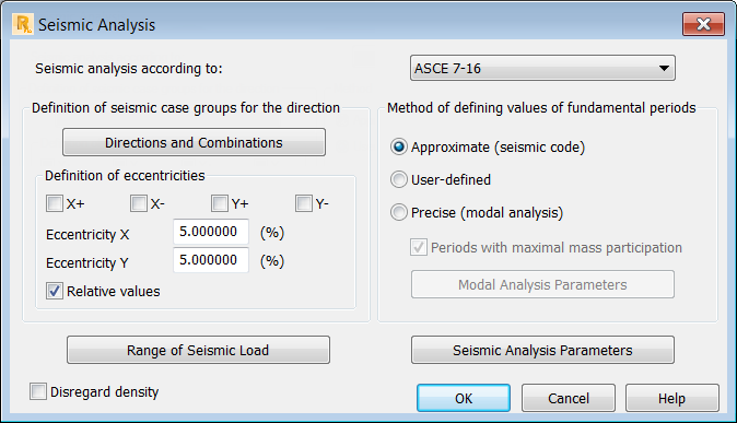 In the lower part of the dialog Range of Seismic Load and Seismic analysis parameters buttons are located.