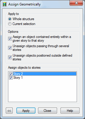 Use the option to assign elements of a structure to defined stories (important during verification of the structure). Access the option by selecting the Geometry > Stories > Assign Geometrically.