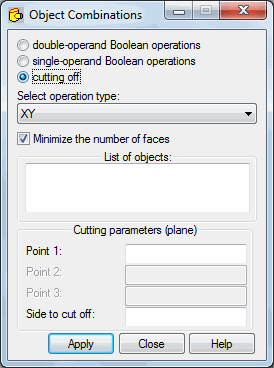 The option lets you determine the parts of the surfaces of the selected objects that are located on one side of a defined plane. The operation yields an object cut-off from the selected objects using a defined plane. Specify the direction in which the selected objects will be cut off in the Side to cut off box.