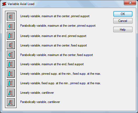 Use this option to determine the support model and the type of variability of axial forces acting on an analyzed steel member. Proposed models correspond to cases described in point 6.3.2.2 of SE-A. Depending on a selected model, the member buckling length Lk is automatically calculated considering the ratio of min./max. axial forces acting in the currently-analyzed load case. The option is available by clicking the Variable axial load button located in the Buckling Diagrams dialog.