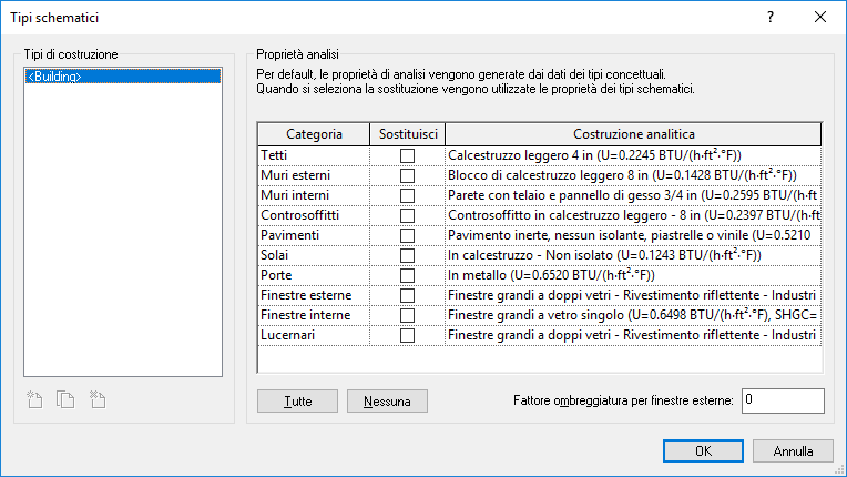 È possibile selezionare le categorie di elementi specifiche di cui si desidera utilizzare i tipi schematici. Qualsiasi categoria di elemento non sostituita con un tipo schematico continuerà ad utilizzare i tipi concettuali di default. Se l'opzione Elementi dettagliati è attivata, i tipi schematici (e i tipi concettuali) vengono sostituiti da proprietà termiche basate sui materiali, dove definito.