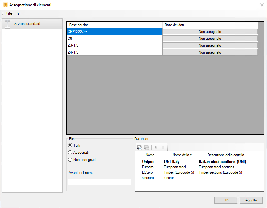 - Quando si fa clic su OK, i profilati del database vengono assegnati a profilati non riconosciuti (sono proprietà geometriche assegnate).