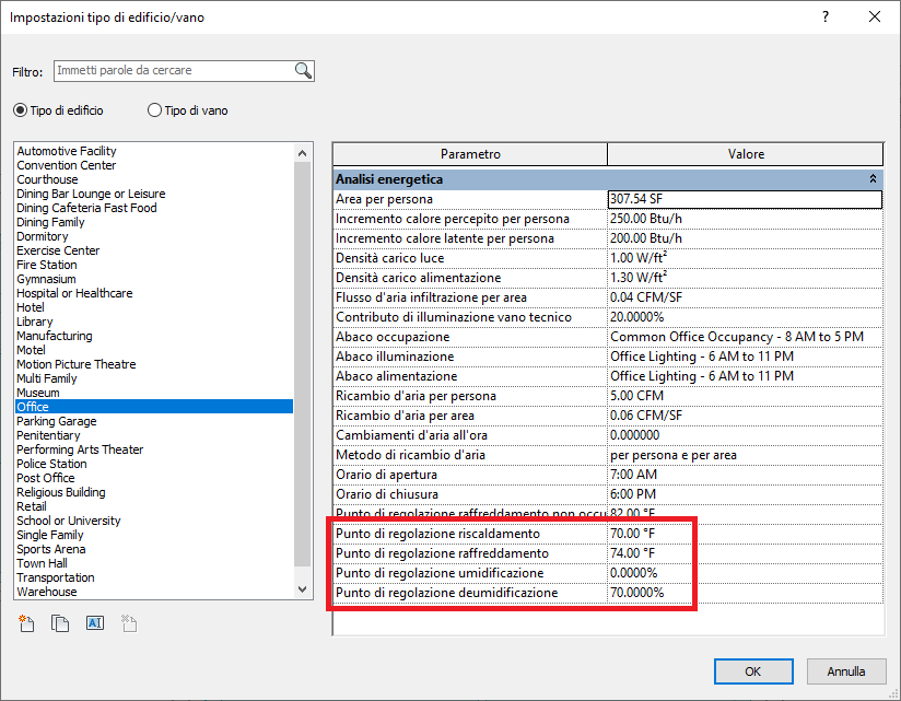 Quando si apre un progetto di Revit 2021 con Revit 2021.1, tutte le impostazioni del tipo di edificio e del tipo di vano utilizzano gli stessi valori precedenti.