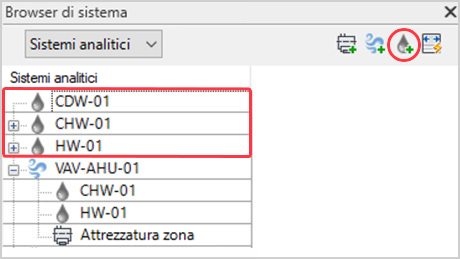 Utilizzare gli strumenti nel Browser di sistema per aggiungere l'attrezzatura zona, i sistemi dell'aria e i circuiti acqua.