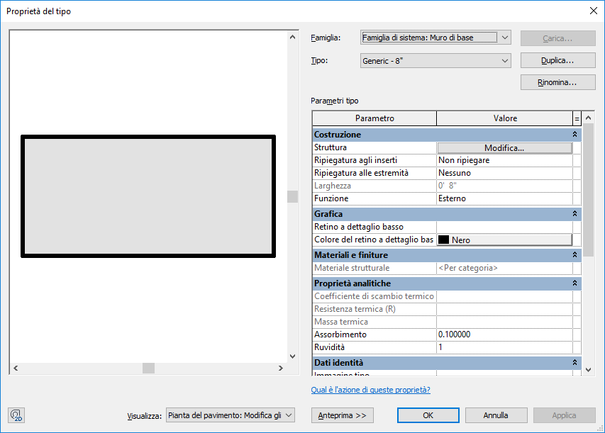 Di seguito è raffigurato un esempio di finestra di dialogo Proprietà del tipo relativa ad un tipo di muro, con il riquadro Anteprima visualizzato.