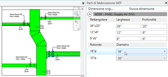 La tavolozza Parti di fabbricazione MEP visualizza informazioni sul servizio e sulle dimensioni di tubazioni/condotti/canaline selezionati.