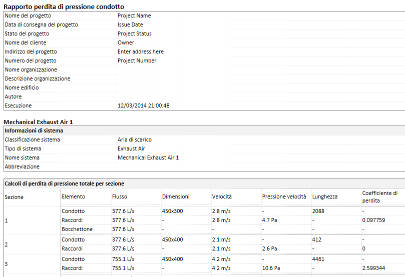I rapporti sulla perdita di pressione di condotti e tubazioni hanno ognuno il proprio formato. Vengono salvati nella stessa posizione come modello di default.