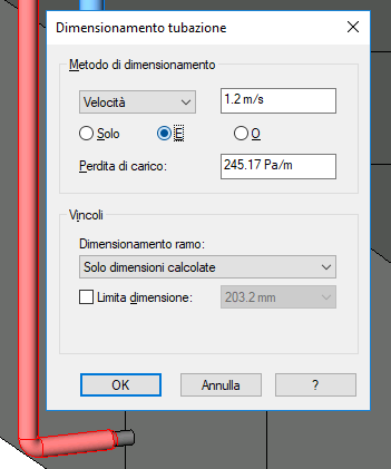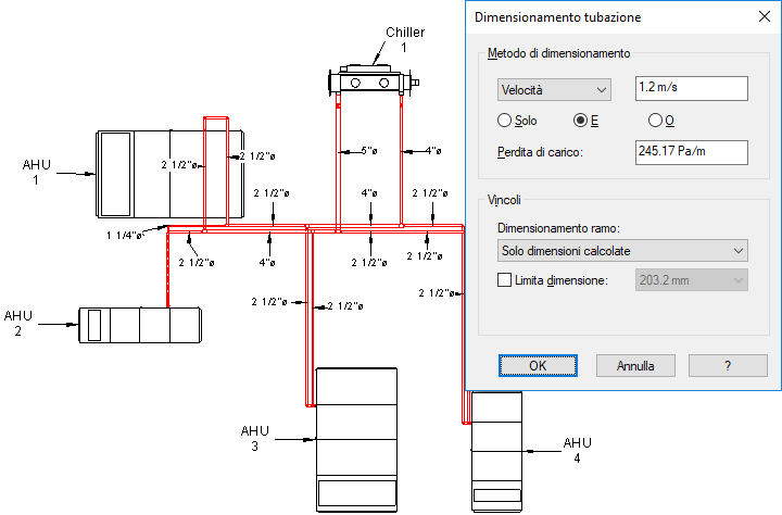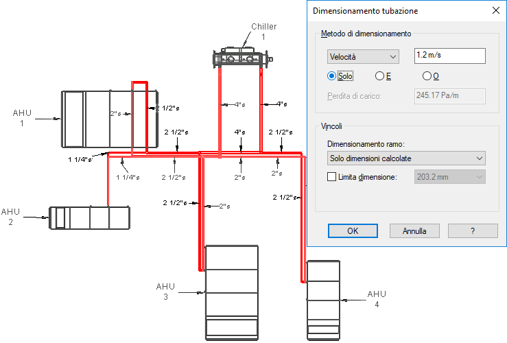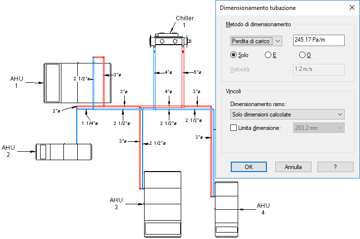 Le immagini seguenti mostrano i risultati dei vari metodi di dimensionamento delle tubazioni di un sistema idronico.