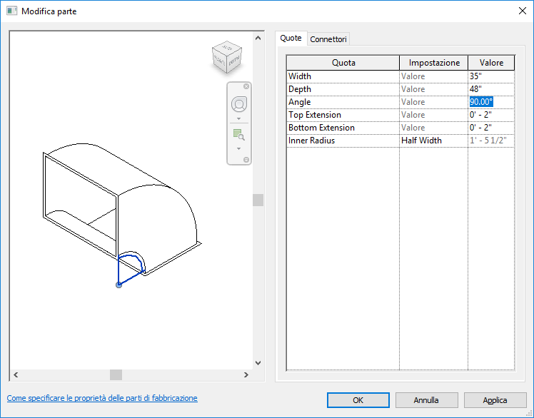 È possibile modificare una parte di fabbricazione in Revit per definire i valori di quota e le impostazioni del connettore necessari.