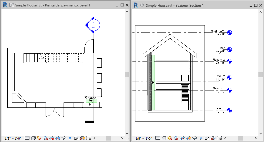 - Chiudere tutte le viste, ad eccezione della vista di sezione e della pianta del pavimento in cui si desidera posizionare il vano e digitare w t sulla tastiera per affiancare le 2 viste.