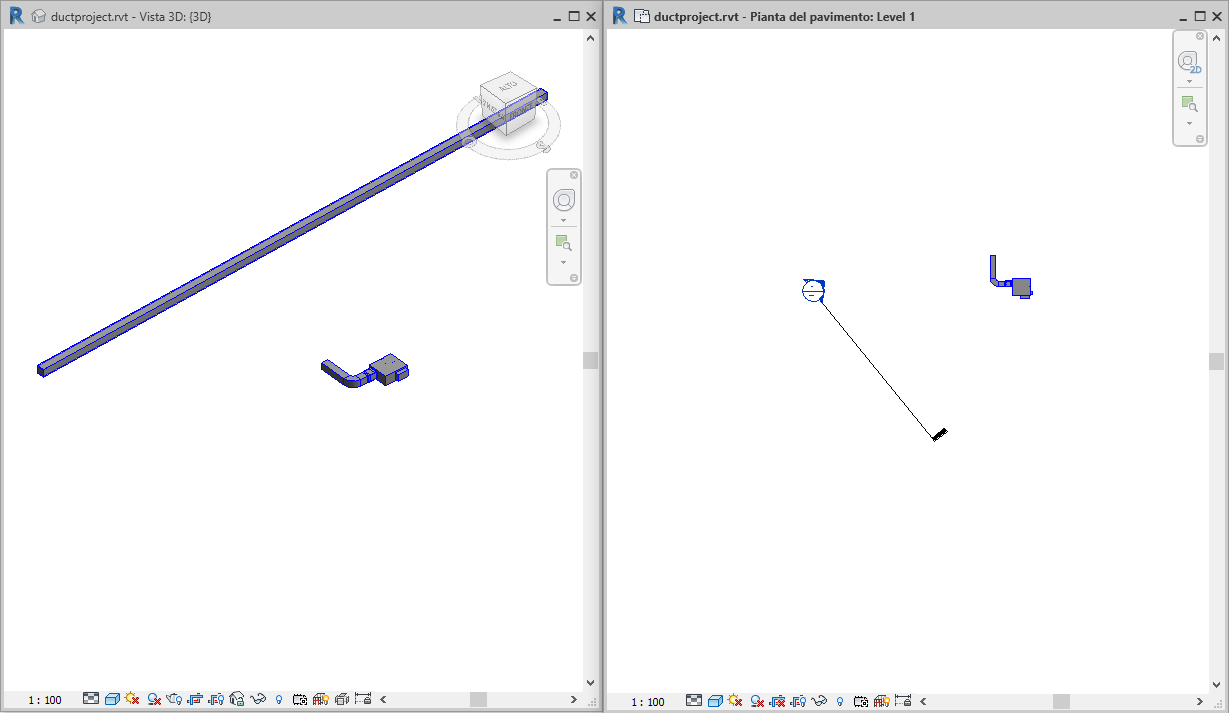 Nella vista 3D associata viene mostrato in che modo il condotto è stato creato. Il condotto risultante viene disegnato con un segmento verticale e un segmento orizzontale per la connessione al condotto sul livello 2. Il segmento orizzontale viene aggiunto perpendicolarmente al piano della vista di sezione.