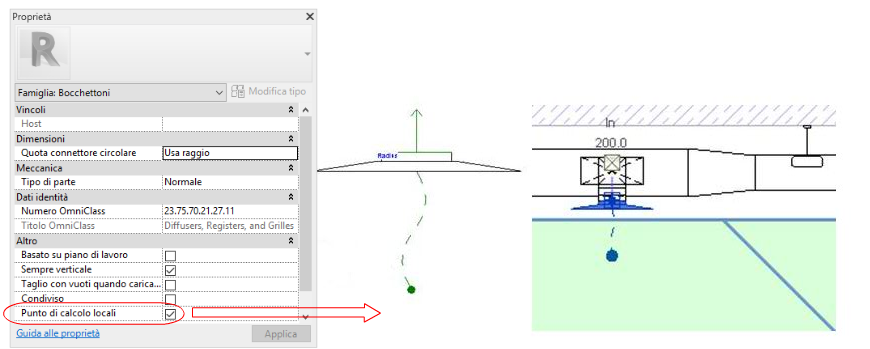 modificare la famiglia in modo che il bocchettone attivi il punto di calcolo locali, quindi spostare la posizione del punto di calcolo in modo che si trovi all'interno del vano. Nell'Editor di famiglie, nella tavolozza Proprietà, selezionare Punto di calcolo locali. Modificare la posizione del Punto di calcolo locali in modo che si trovi all'interno del vano.