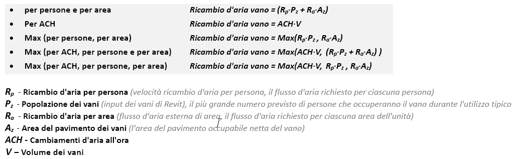 | Metodo di ricambio d'aria | Quando viene selezionato un vano, questa proprietà mostra il metodo di calcolo della richiesta di ricambio d'aria richiesta in un vano. Utilizzare la finestra di dialogo Impostazioni tipo di edificio/vano per specificare uno dei seguenti metodi, che vengono calcolati come mostrato di seguito: