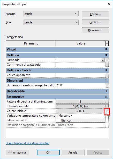 - Selezionare la famiglia di sorgenti di illuminazione nel Selettore di tipo.