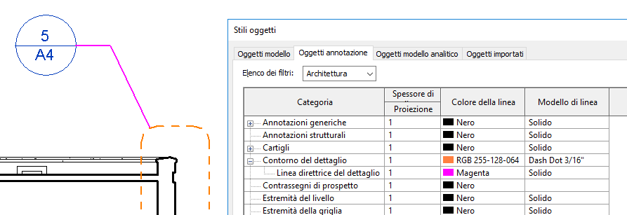 È possibile definire lo spessore, il colore e il modello di linea dei simboli circolari di dettaglio e delle linee direttrici. Queste impostazioni vengono applicate a tutti i dettagli contenuti nel progetto.