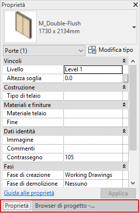 Nella seguente immagine, il Browser di progetto e la tavolozza Proprietà sono stati raggruppati. Notare che la tavolozza Proprietà è la scheda attiva.