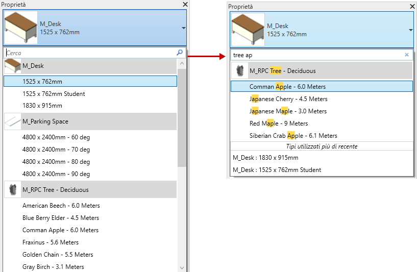 Revit LT semplifica la selezione in un elenco contenente molte opzioni. È possibile eseguire la ricerca nelle seguenti aree funzionali: