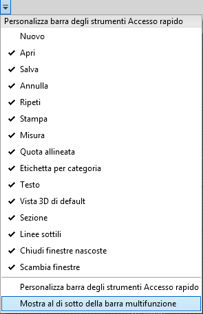 È possibile visualizzare la barra degli strumenti Accesso rapido al di sotto o al di sopra della barra multifunzione. Per modificare questa impostazione, nella barra degli strumenti Accesso rapido, fare clic sul menu a discesa Personalizza barra degli strumenti Accesso rapido