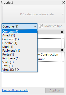 Immediatamente sotto il Selettore di tipo è disponibile un filtro per identificare la categoria degli elementi inseriti da uno strumento, oppure la categoria e il numero di elementi selezionati nell'area di disegno. Se sono state selezionate più categorie o tipi, nella tavolozza vengono visualizzate solo le proprietà comuni a tutte le istanze. Se sono selezionate più categorie, utilizzare l'elenco a discesa del filtro per visualizzare solo le proprietà relative ad una categoria specifica o alla vista stessa. La selezione di una categoria specifica non interessa l'intero gruppo di selezione.