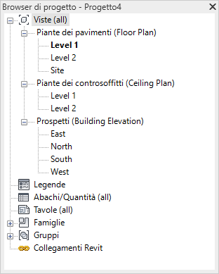 Nel Browser di progetto viene visualizzata una gerarchia logica di tutte le viste, tutti gli abachi, tutte le tavole, tutti i gruppi e altri componenti del progetto corrente. Espandendo e comprimendo i singoli rami è possibile visualizzare gli elementi dei livelli inferiori.