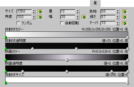 グラデーションは、星の効果でも他の効果の場合と同じです。ただし、[断面カラー](Section Color)と[断面透明度](Section Transparency)は例外です。これらのオプションは、スポークに柔らかさを出す場合に便利です。どちらのグラデーションも、各スポークの中央からスポークの外側エッジへ向かって作用します。