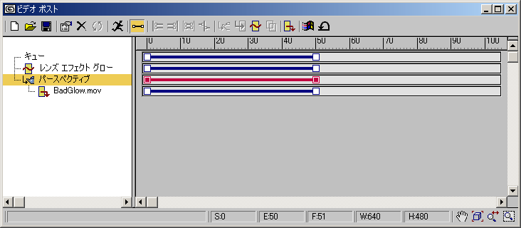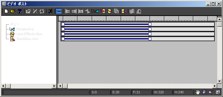 このキューの場合も、すべて正しいイベントが使用されています。しかし、問題は、キュー内でのイベントの順序にあります。この問題のよくある原因は、イベントが選択されている状態で、他のイベントを追加したことです。この場合は、パース イベントが選択された状態で、レンズ エフェクト グロー イベントと出力イベントを追加しました。