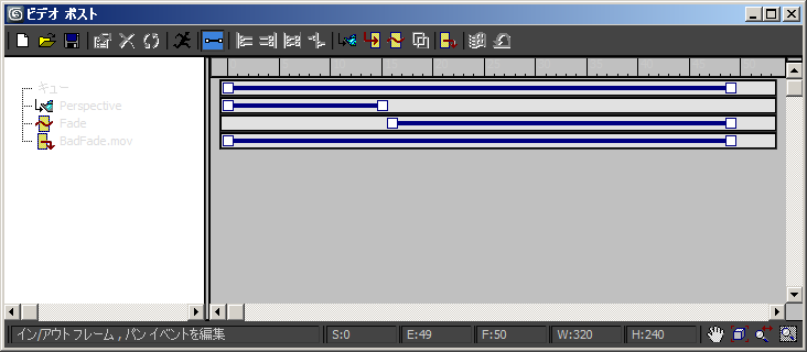このキューでは、正しいイベントがすべて、適切な順序で配置されています。問題は、範囲バーのタイミングと位置です。この問題の最もよくある原因は、不必要なところで[選択された境界](Abut Selection)を使用したことです。フェード イベントが正しく機能するためには、フェードを発生させたい時間に渡ってアニメーションがオーバーラップしている必要があります。シーンが実際にフェードするフレーム数を考慮に入れる必要があるわけです。