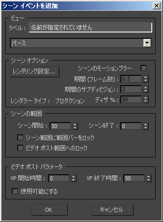 [シーン イベントを追加](Add Scene Event) をクリックし、ビューを[パース](Perspective)またはシーン内にあるカメラに設定します。 [OK]をクリックして[シーン イベントを追加](Add Scene Event)ダイアログ ボックスを閉じます。