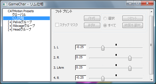[リム位相](LimbPhases)パネルでは、CATMotion の腕と脚のモーションのグローバルな設定を行います。