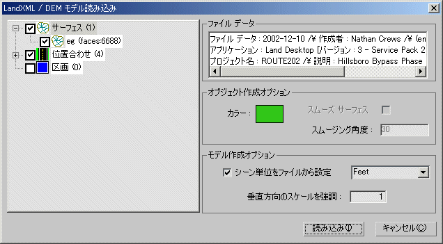 - 読み込むファイル内の地表サーフェス、位置合わせデータ、区画データをリストします。チェック ボックスを使って、オブジェクトを個別に読み込むか、オブジェクト グループ全体を読み込むかを切り替えることができます。