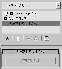 リンクされたオブジェクトは、[修正](Modify)パネルに[リンクされたジオメトリ](Linked Geometry)オブジェクトとして表示されます。これらのオブジェクトからは、編集が行われる可能性のあるサブオブジェクト レベルにアクセスすることはできません。リンクされたジオメトリ オブジェクトを移動、回転、スケールした場合、[位置をリセット](Reset Position)オプションが使用できます。