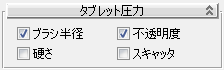 グラフィック タブレット(ペン タブレット)でペイントする場合は、描画時のタブレット上のペン圧を変更することによって、以下の設定を変化させることができます。