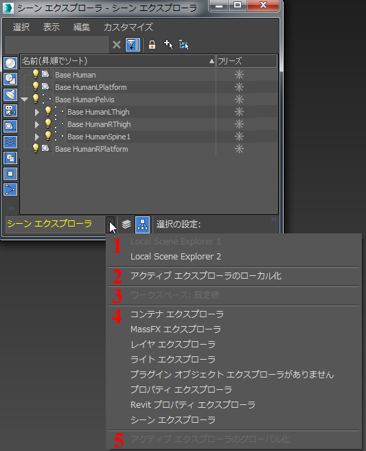 - ワークスペース シーン エクスプローラの名前です。既定では、このエクスプローラは開かれ、ビューポートの左側にドッキングされているため、メニューでは名前がグレー表示されクリックできません。ワークスペース シーン エクスプローラが閉じている場合、このリスト内で名前をクリックすることで、アクティブなシーン エクスプローラを置き換えることができます。