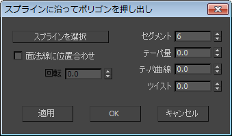 このボタンをクリックし、ビューポート内のスプラインを選択します。押し出しはこのスプラインに沿って行われます。スプライン オブジェクト名がボタン上に表示されます。