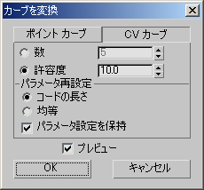 - ポイント カーブに変換するか、CV カーブに変換するかを選択します。カーブが既に選択している種類のカーブの場合、このダイアログ ボックスの設定は変換されませんが、プロパティは変更されます。既定値は CV カーブです。
