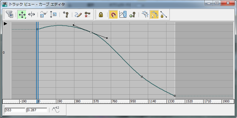 カーブ上の各正方形は単一のアニメーション キーを表します。 キーを移動、追加、除去したり、キーの接線を調整することができます。 アニメーション キーに変更を加えるたびに、選択したオブジェクトのアニメーション全体が影響を受けます。