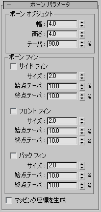 これらのコントロールを使って、ボーンの外観を変更します。これらは、[ボーン ツール](Bone Tools )ダイアログ ボックスの[フィン調整ツール](Fin Adjustment Tools)ロールアウトでも利用できます。