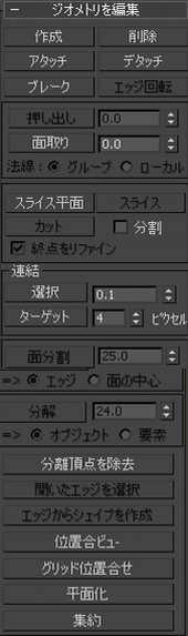 これらのコントロールの詳細については、「[ジオメトリを編集](Edit Geometry)ロールアウト(メッシュ)」を参照してください。