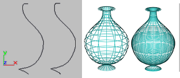 最適化されたスプライン(左)とアダプティブ スプライン(右)。右側は、その結果得られるそれぞれのワイヤフレーム ビュー