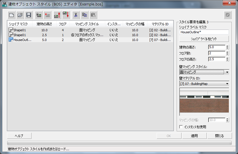 BOS 要素リストで選択した建物スタイルの設定が表示され、スタイルを適用するシェイプを選択できます。