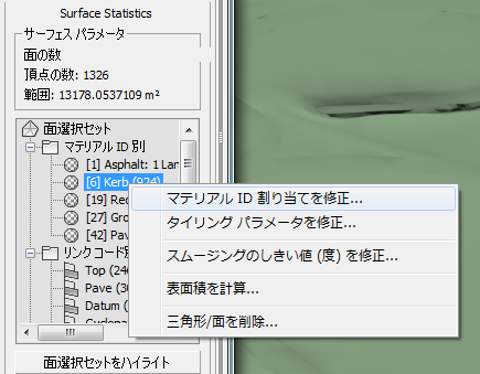 - サーフェスの三角形/面の選択セットを一覧表示します。 主な選択セットは、選択したサーフェスで使用される CivilViewSurfaces マテリアル チャネルの範囲です。 このリストは、選択したサーフェスで使用されるマテリアル タイプの概要を提供します。