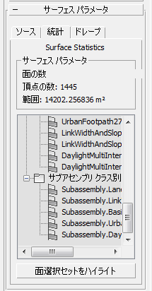 読み込んだ AutoCAD Civil 3D コリドー サーフェスについては、さまざまな範囲の三角形/面の選択セットが表示されます。これらの選択セットはソース コリドー構造に直接関連します。 これにより、元のリンク コード、サブアセンブリ名、およびサブアセンブリ クラスで個々の面を識別できます。